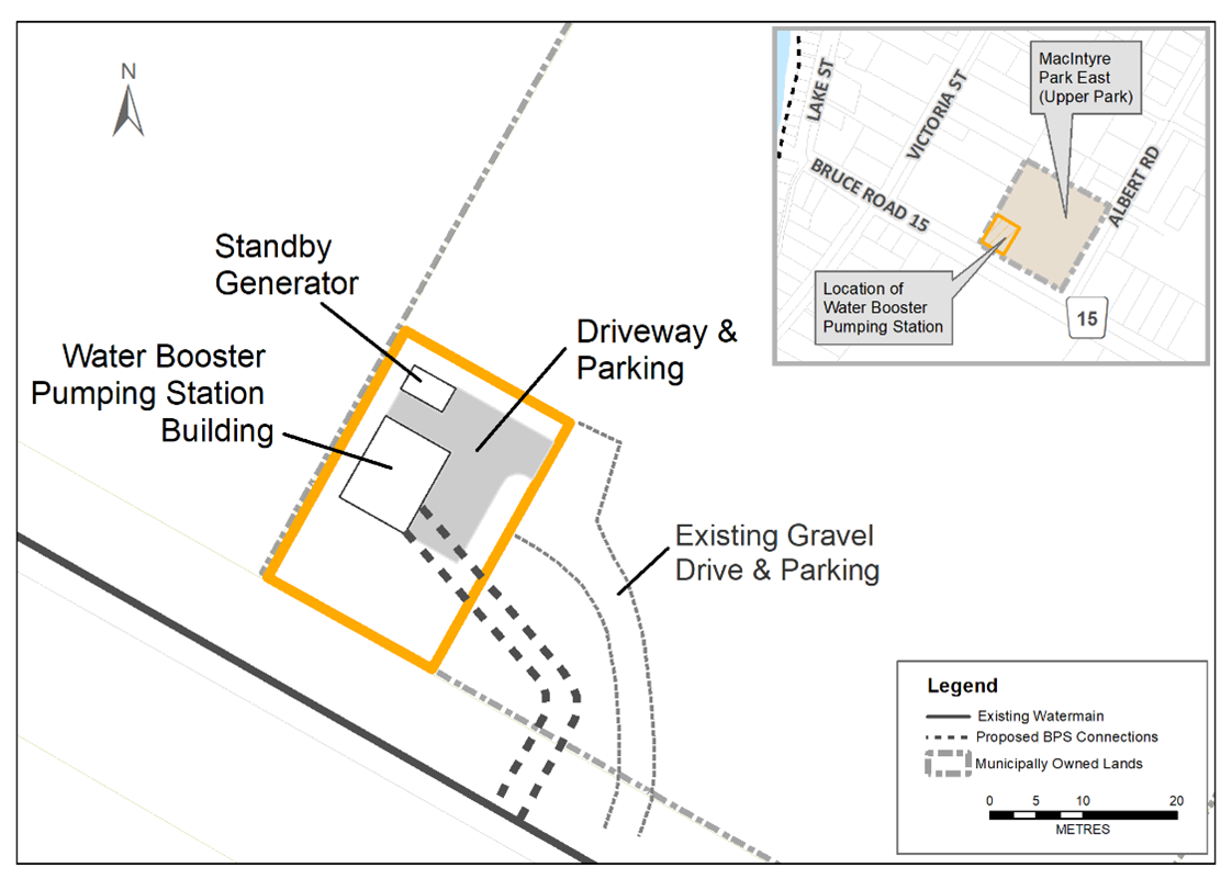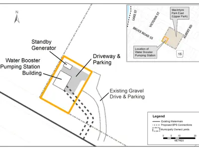 The Municipality of Kincardine has completed a Municipal Class Environmental Assessment (MCEA) to investigate options for increasing the supply capacity of the Tiverton drinking water system and addressing concerns related to the condition of some of the existing groundwater wells. Following the evaluation of alternative solutions, the preferred solution is to connect the Tiverton drinking water system to the Kincardine drinking water system with a water booster pumping station at 3194 Bruce Road 15 in Inverhuron as shown in the included map. This solution was chosen as there is sufficient capacity in the Kincardine Drinking Water System to supply existing and future residents of Tiverton, it removes the need in the short-term to replace an existing well in Tiverton and over the long-term is expected to have lower maintenance and operating costs compared to the current groundwater system.